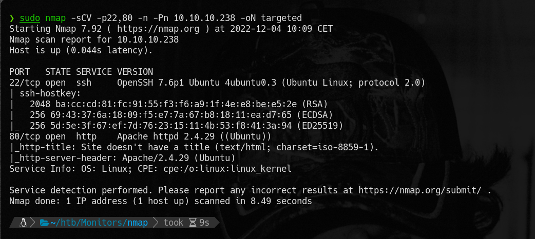 sudo nmap -sCV -p22,80 -n -Pn 10.10.10.238 -oN targeted