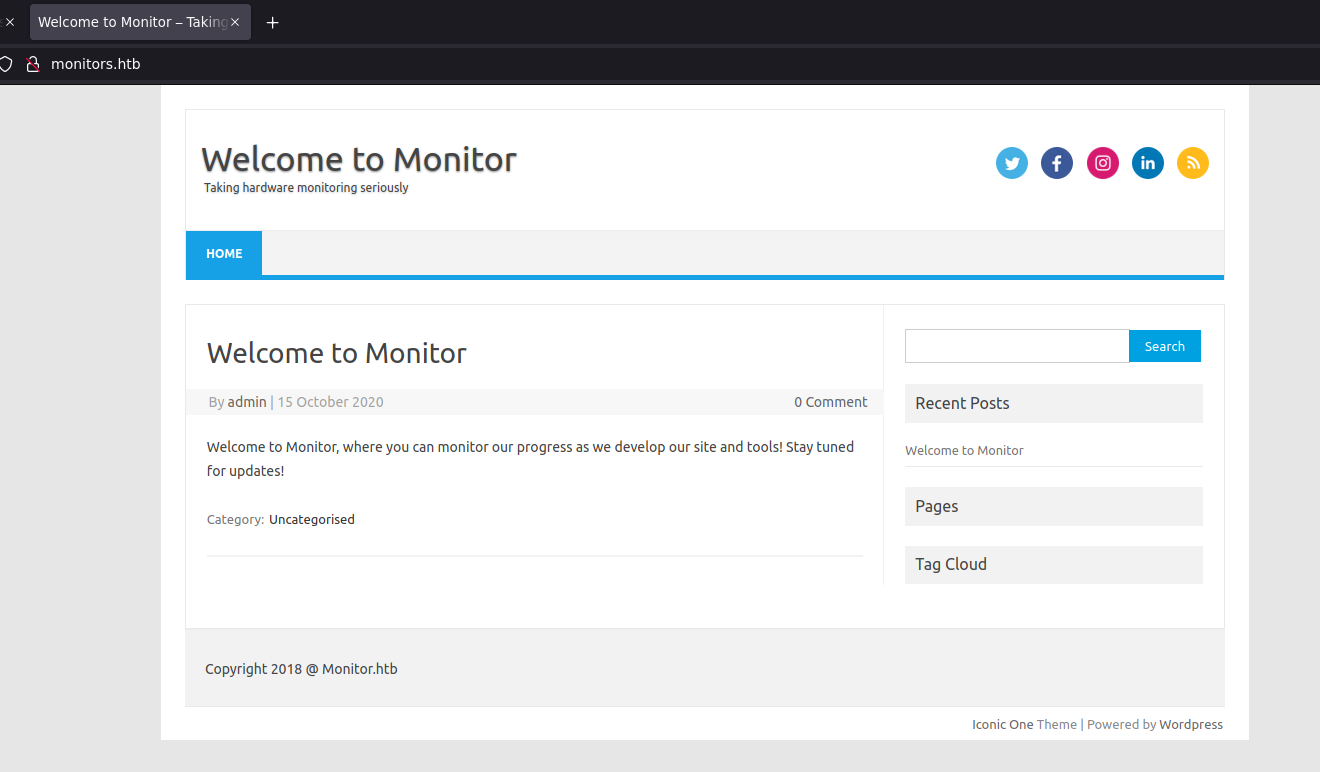 Entramos a la web y vemos que se aplica Virtual Hosting ya que cambia el contenido, leyendo el pie de pagina vemos que estamos frente a un wordpress por lo que podríamos enumerar usuarios validos en el login pero en este caso no ya que solo hay un post del usuario admin.