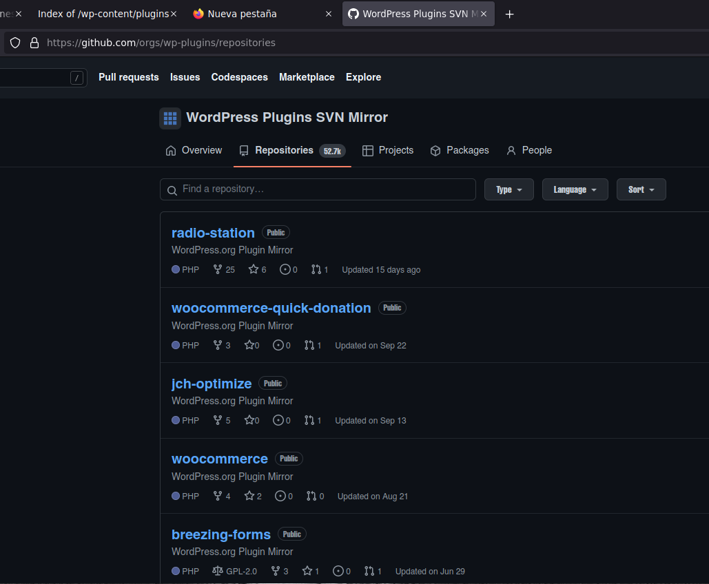Para esto podríamos usar el repositorio de seclists en github que nos incluye diccionarios para probar fuzzeando o mejor aun construirnos un script que nos permita crear un diccionario con los nombres de los 52.700 plugins registrados.