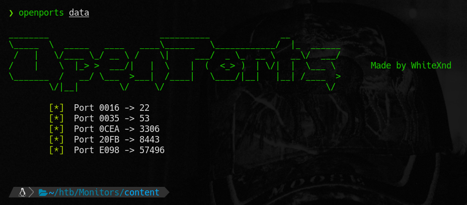 Y con la herramienta que creé y que está en mi github: https://github.com/whitexnd/OpenPorts podemos ver que puertos tiene abiertos internamente en este caso el 80 no sale representado lo cual es un poco raro y vemos tambien el puerto 8443 el cual tambien es un poco raro