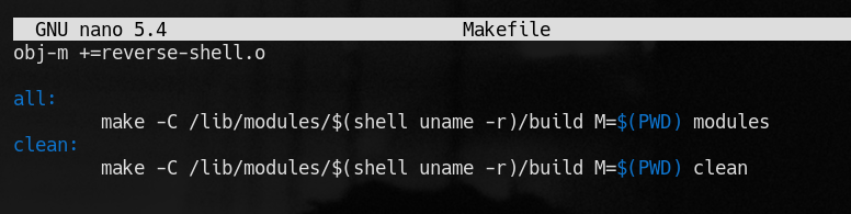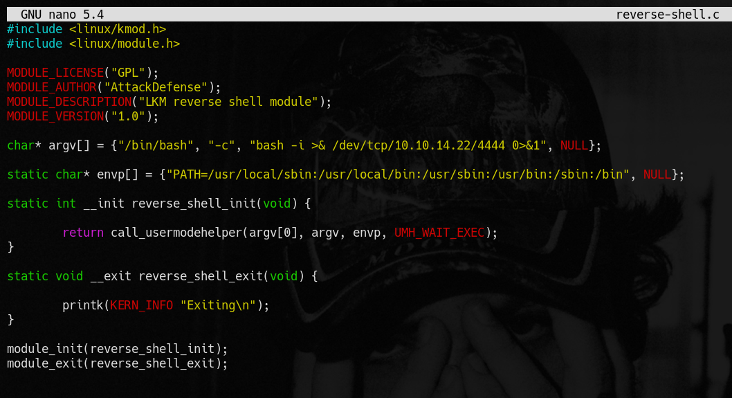 En este caso tenemos que crearnos el siguiente archivo con nuestra ip y puerto para intentar cargar un modulo kernel que nos entable una reverse shell